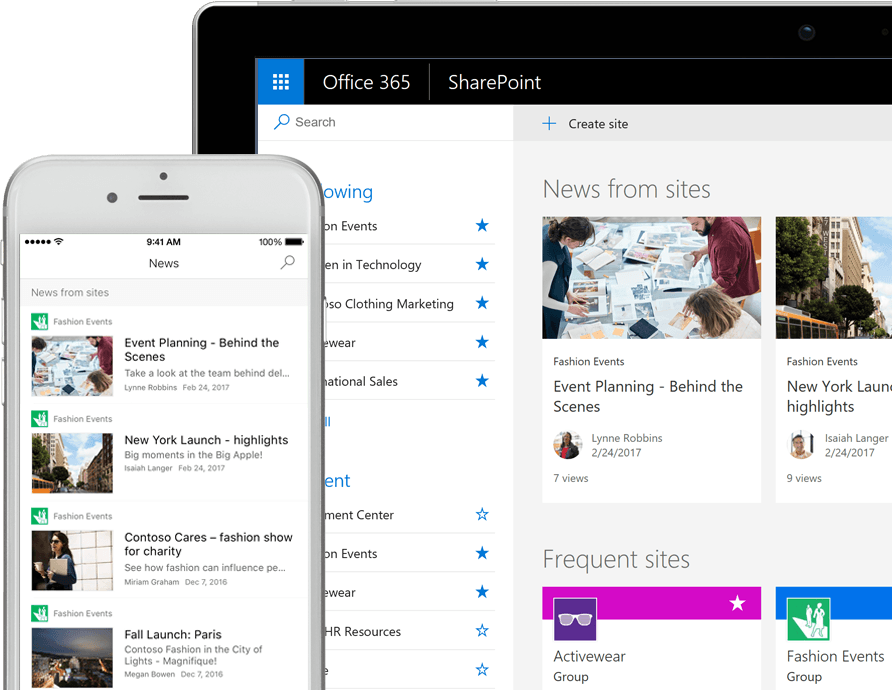 Spanning on-premises and Office 365, the mobile and intelligent intranet brings together the productivity of SharePoint Team Sites, the broadcast reach of publishing sites and portals, and mission critical business applications—accessible from your desktop to your mobile phone – and powered by the Microsoft Graph so information finds you, instead of you having to find information.